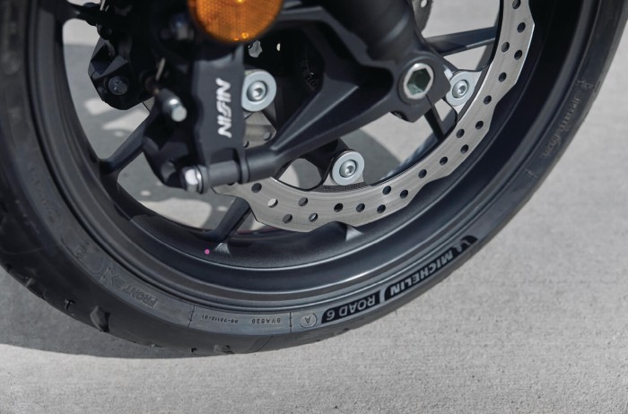 Dual front 296mm discs and Nissin radial-mount, 4-piston calipers deliver impressive stopping power, with excellent progressive feel through the lever. A 240mm disc offers powerful braking in the rear.