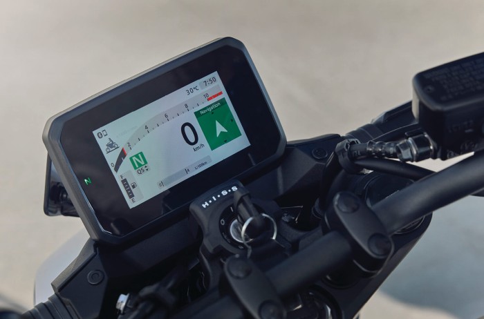 The 5-inch full colour high-visibility screen offers four types of speed/rpm display – analogue or bar, according to rider preference – as well as fuel gauge/ consumption, riding mode selection/ engine parameters, gear selected and customisable shift-up point on the tachometer. Management is via the screen and switchgear on the left handlebar.